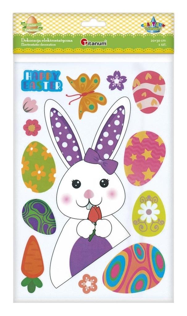 Dekoracje bezklejowe, wielokrotnego użytku - można je zdjąć i przykleić ponownie do gładkich powierzchni takich jak szyby, lustra. Przed montażem powierzchnię, na której będzie dekoracja, należy zrosić wodą z kilkoma kroplami płynu do mycia naczyń, najlepiej za pomocą spryskiwacza, usunąć folię ochronną, ułożyć dekorację na docelowej powierzchni, wycisnąć resztki wody spod dekoracji za pomocą płaskiego narzędzia i osuszyć dekorację papierowym ręcznikiem. Wzory: zając z tulipanem, pisanki, motyl, marchewka, kwiaty, napis 'HAPPY EASTER'. 14 sztuk.