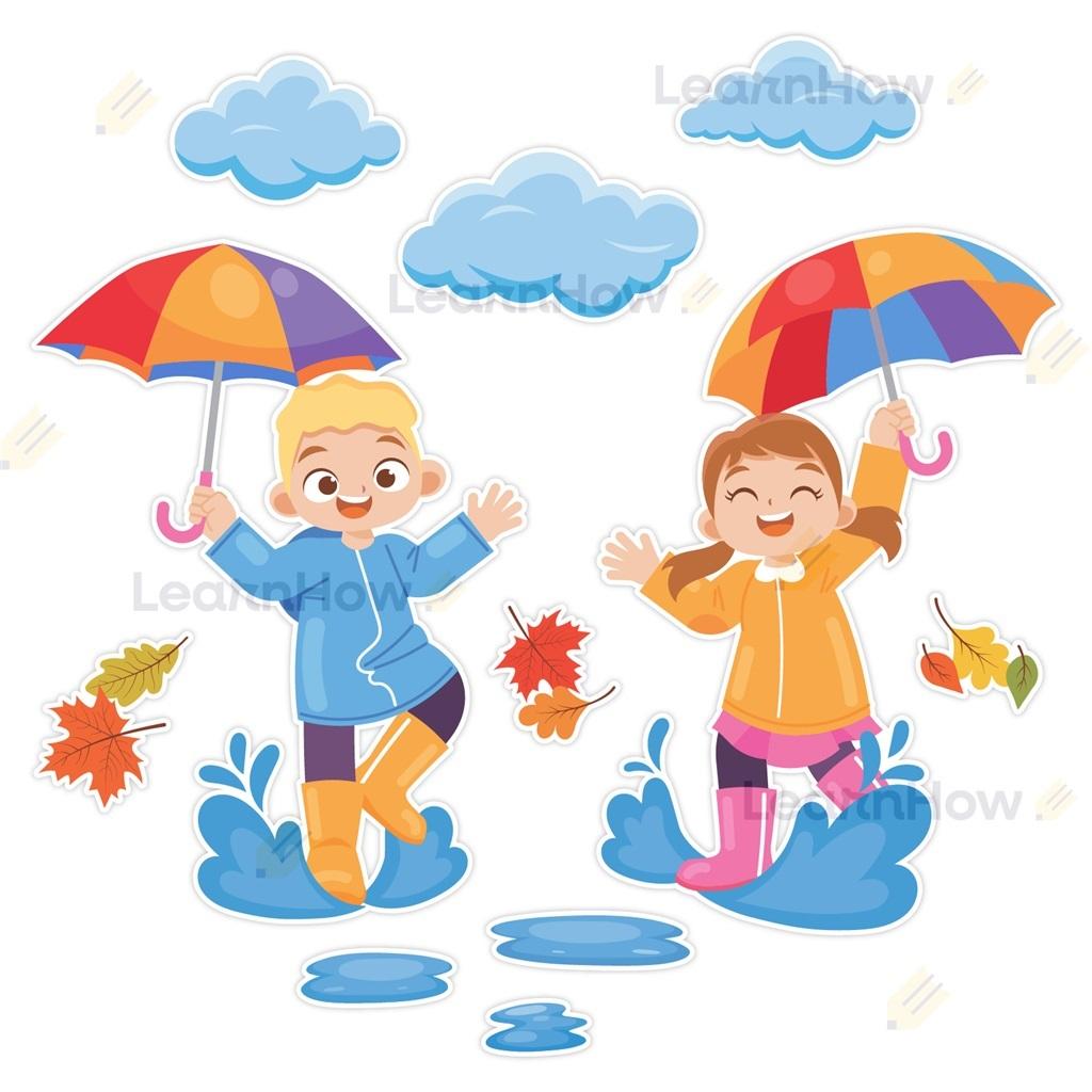Zestaw składa się z 2 dzieci, 3 chmurek i innych jesiennych elementów - idealne do jesiennej dekoracji szkoły i przedszkola.