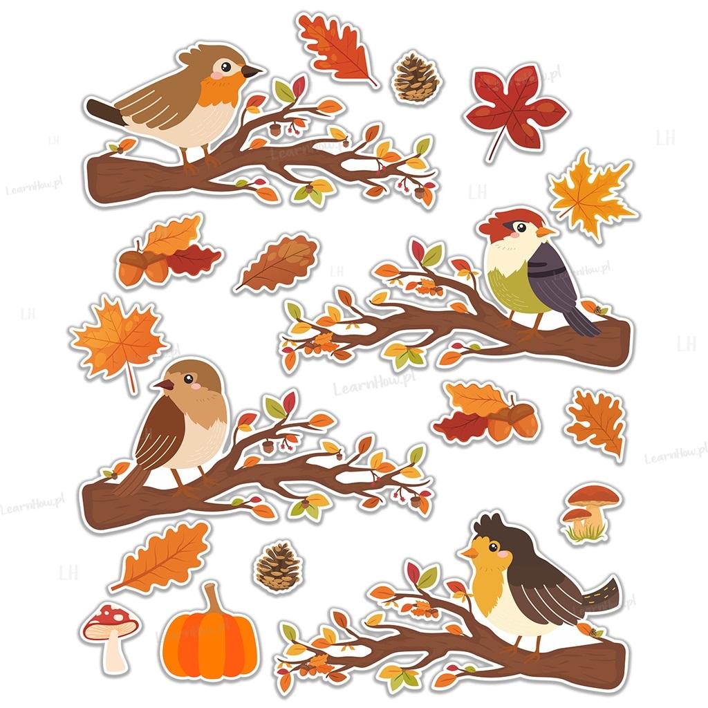 Duży zestaw dekoracji składa się z 4 dużych ptaków na gałęziach i dodatkowych elementów - idealne do jesiennej dekoracji szkoły i przedszkola.