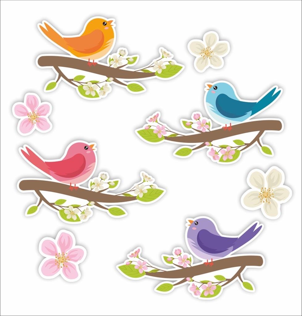 Zestaw składa się z 4 różnych ptaków i 4 kwiatki - idealne do wiosennej dekoracji szkoły i przedszkola.