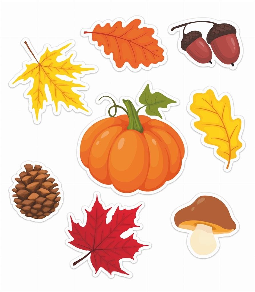 Dekoracja jesienna zawiera 8 jednostronnych elementów: 4 liście, żołędzie, szyszkę, grzybka oraz dynię.