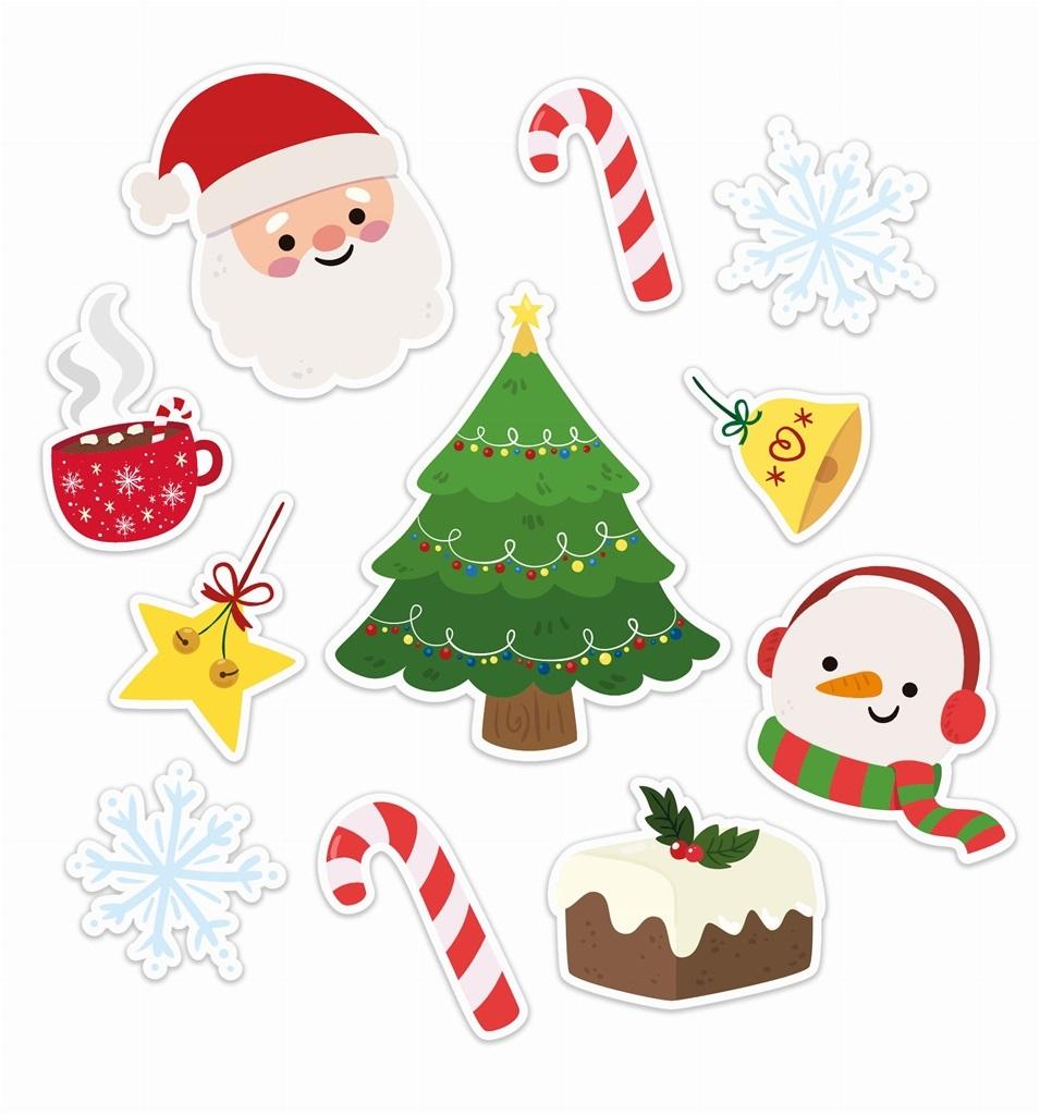 Dekoracja świąteczna zawiera 11 jednostronnych elementów: Mikołaja, gorący kubek, dwie laski, dwa płatki śniegu, ciasto, bawłanka oraz dużą choinkę.