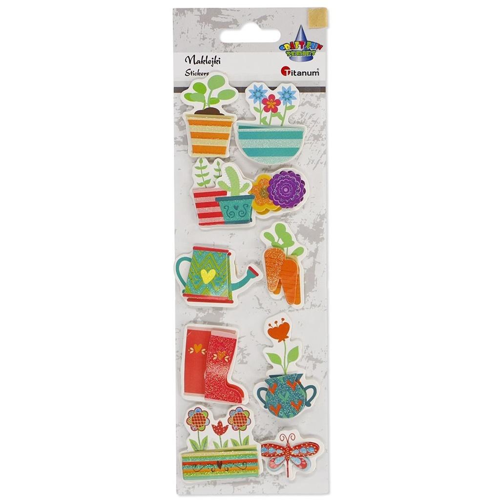 Dekoracje samoprzylepne papierowe 3D kwiatki w doniczkach, konewka, kalosze, marchewka, motyl z brokatem 10szt.