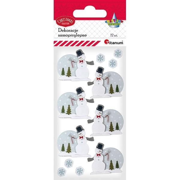 Dekoracje samoprzylepne papierowo-foliowe 3D bałwanki ze śnieżnymi kulami 34x29mm i płatki śniegu 9mm 12szt.