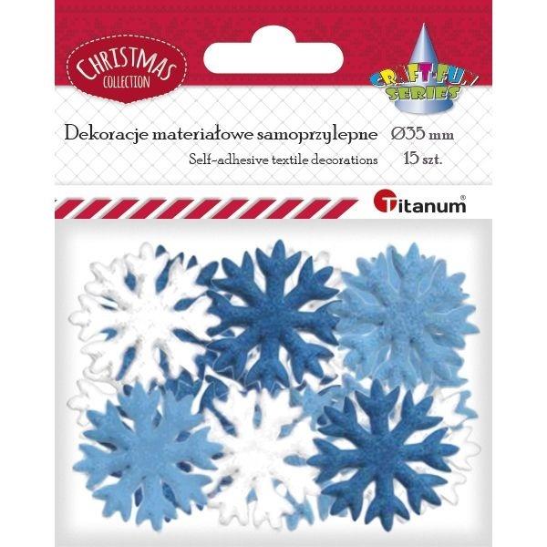 Dekoracje samoprzylepne materiałowe płatki śniegu 35x35mm białe, jasnoniebieskie, niebieskie 15szt.