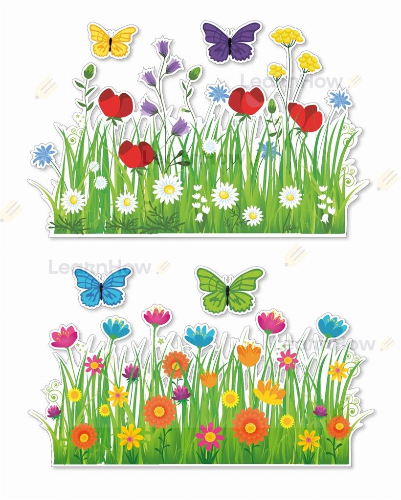 Duży zestaw dekoracji składa się z 2 dużych ilustracji łąki z kwiatami oraz 4 małych kolorowych motylków!