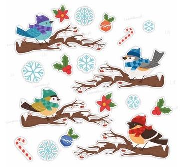 Duży zestaw dekoracji składa się z 4 dużych ptaków na gałęziach i dodatkowych elementów - idealne do zimowej dekoracji szkoły i przedszkola.