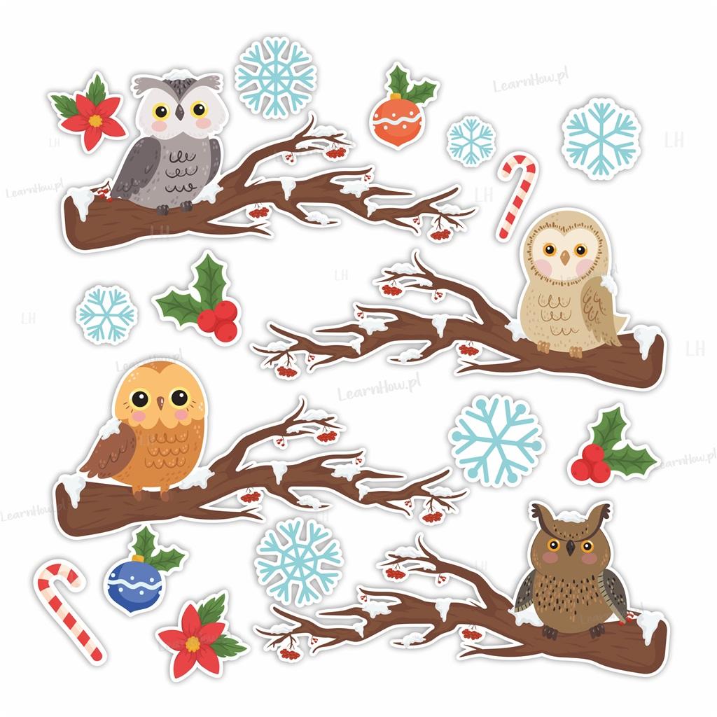Duży zestaw dekoracji składa się z 4 duże sowy na gałęziach i 14 dodatkowych elementów - idealne do zimowej dekoracji szkoły i przedszkola.