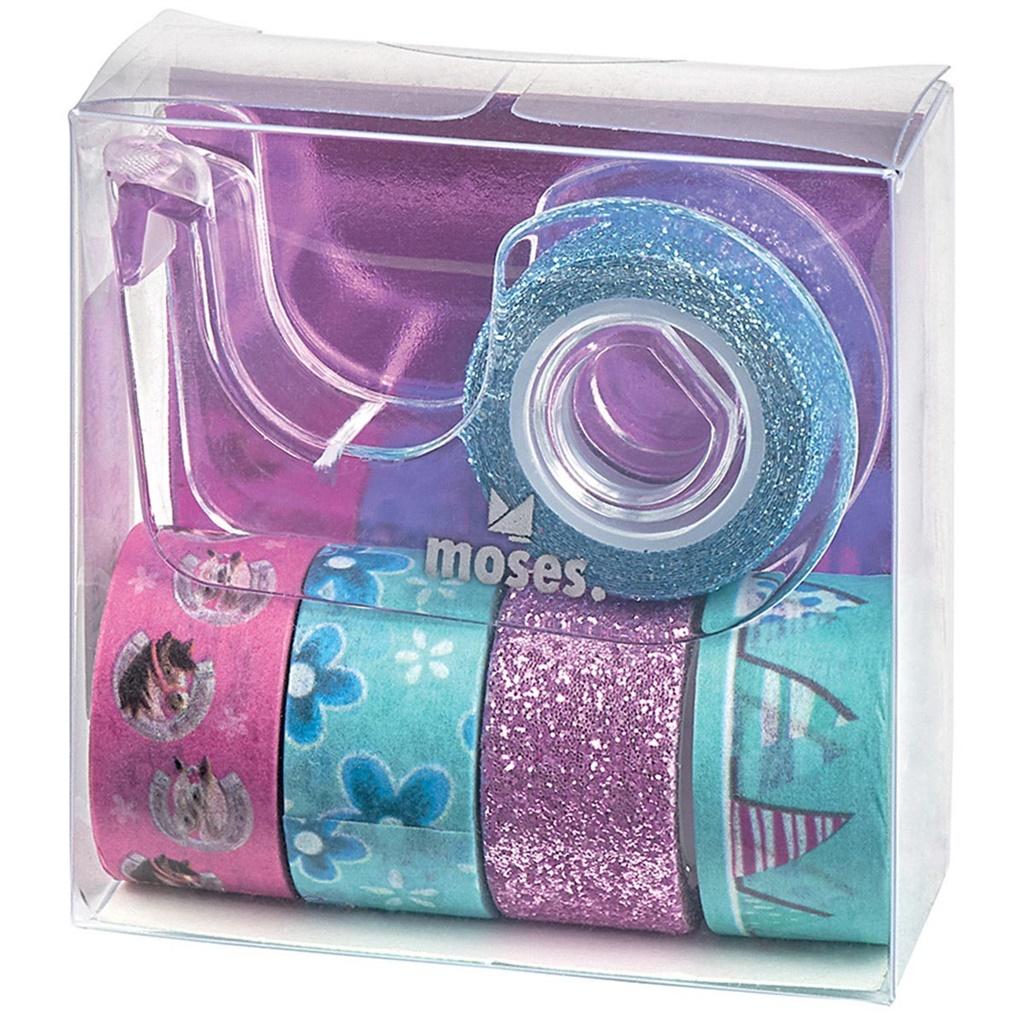 • W zestawie: Przeźroczyste pudełko, 5 rodzajów taśm papierowych i brokatowych z dyspenserem.