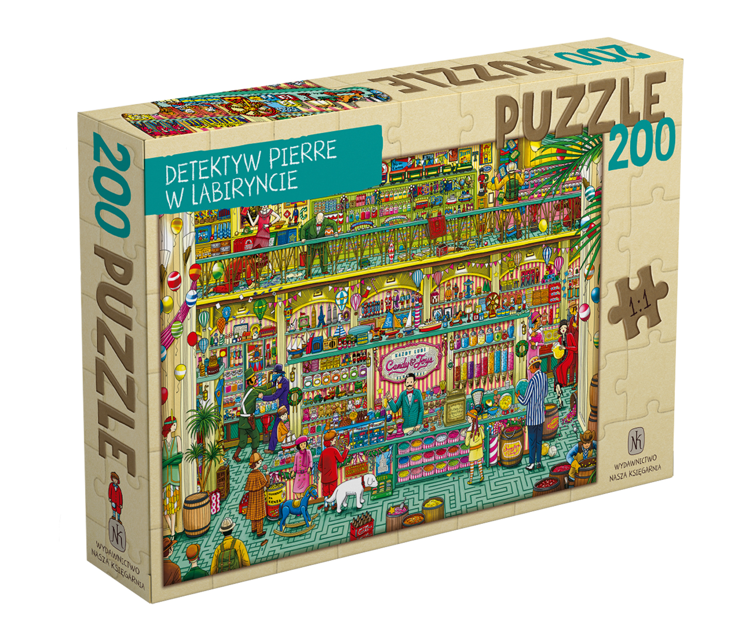 W tym niezwykłym sklepie można znaleźć wszystkie łakocie, o jakich marzysz! Są tu słoje wypełnione landrynkami, okrągłe lizaki, batony czekoladowe i mnóstwo zabawek. Jeśli chcesz je dokładnie obejrzeć, ułóż obrazek. Dodatkowo możesz zabawić się w detektywa i spróbować odszukać wskazane na pudełku wybrane elementy. Niezwykła gratka dla wszystkich fanów detektywa Pierre'a, znanego z serii książek Detektyw Pierre w labiryncie. Puzzle składają się z 200 elementów, a obrazek po ułożeniu ma wymiary 47 x 33 cm.