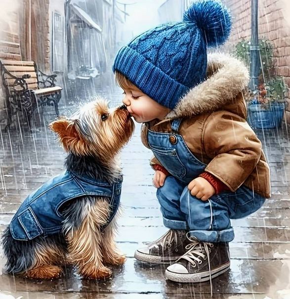 Diamentowa Mozaika Chłopiec i pies buziak w deszczu NO-2001527