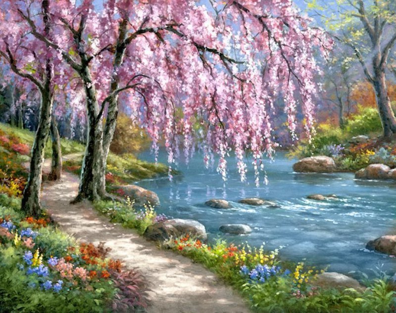 Diamentowa mozaika drzewo różowe nad potokiem NO-1006407