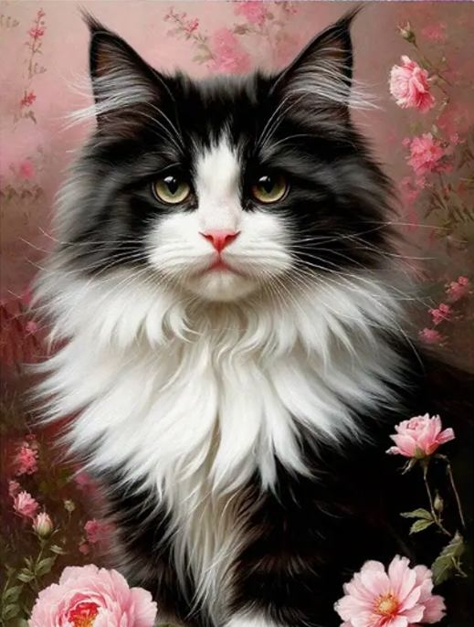 Diamentowa Mozaika Kot czarno-biały w różowych kwiatach NO-2003057