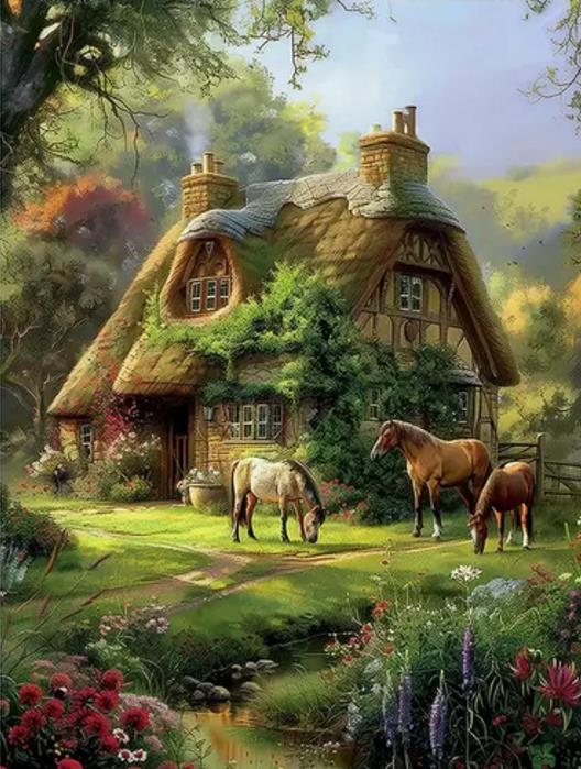 Diamentowa Mozaika Leśna chata i konie NO-2001762