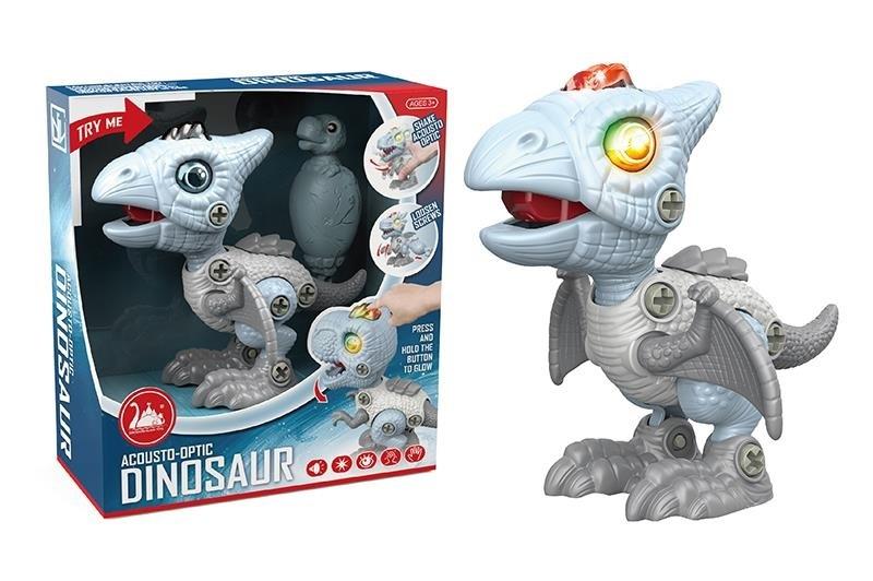 W zestawie: dinozaur do skręcania, śrubokręt, funkcje: świecące oczy, dźwięki dinozaura, wym. Opk: 14,5 x 16 x 7 cm., Baterie 3+