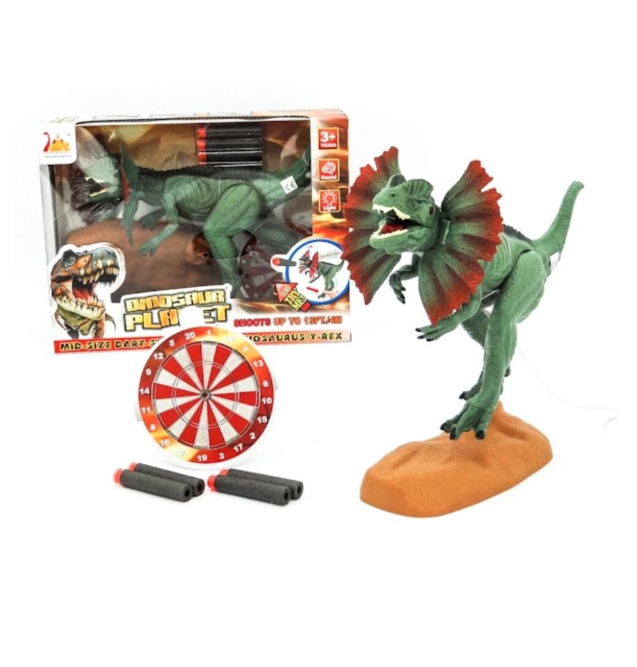 Dinozaur strzelający piankowymi pociskami. Tarcza i pociski w zestawie. Dinozaur ze światłem i dźwiękiem.