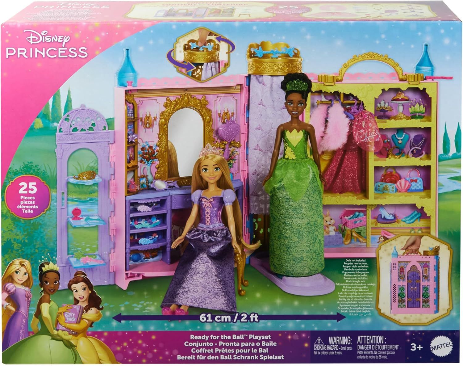 Zestaw Garderoba Księżniczki Przygotowania do balu z ubrankami, akcesoriami i mnóstwem możliwości zabawy to doskonałe miejsce, w którym każda lalka Księżniczka Disneya (nie znajduje się w zestawie) może wyszykować się na przyjęcie. Po otwarciu zestaw ma ponad 60 cm szerokości i odsłania toaletkę z lustrem, garderobę z zasłoną oraz wybieg do prezentowania królewskich stylizacji. Są tu też 2 ubranka, 25 akcesoriów i mnóstwo miejsca do ich przechowywania. Zamknij zestaw i podziwiaj jego piękny wygląd z detalami księżniczek i uchwytem do łatwego zabrania zabawy ze sobą, gdziekolwiek chcesz. Ta szafa zabawka dla dzieci to wspaniały prezent dla wszystkich małych stylistów.