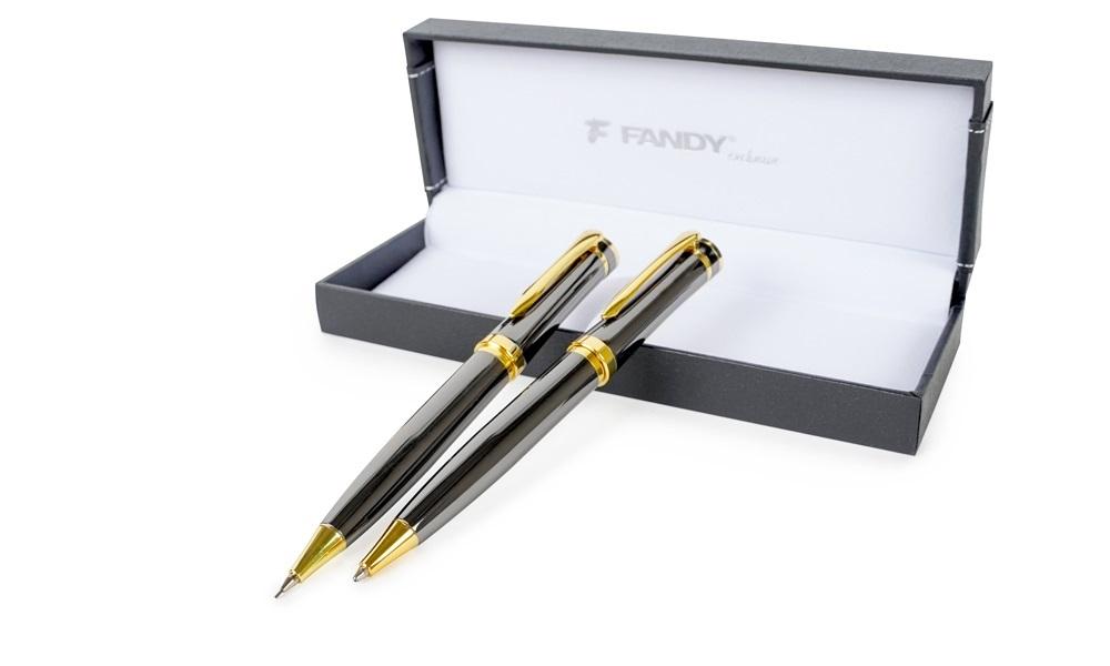 zestaw długopisu metalowego oraz ołówka automatycznego, mechanizm obrotowy, wymienny wkład F-Parker, grubość linii 0,7 mm, niebieski kolor tuszu (długopis), grubość grafitu 0,5 mm (ołówek automatyczny), luksusowe pudełko