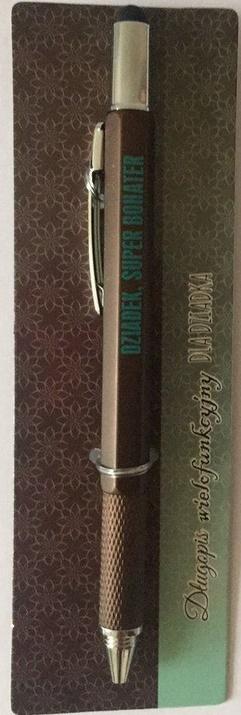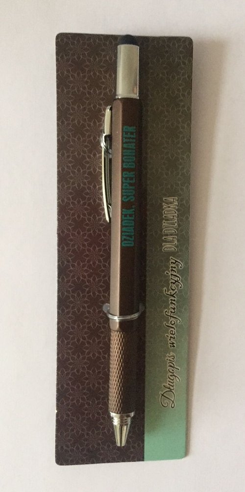 "*długopis ze specjalną dedykacją dla dziadka: „Super bohater"" *posiada 6 funkcji: długopis, miarkę w cm i calach, poziomicę, końcówkę touch do pisania na ekranach telefonów, tabletów oraz może służyć jako śrubokręt (krzyżakowy i płaski). Końcówka śrubokrętu schowana jest w końcówce touch, należy ją odkręcić i wyjąć. *doskonały pomysł na prezent dla dziadka nie tylko z okazji jego święta"