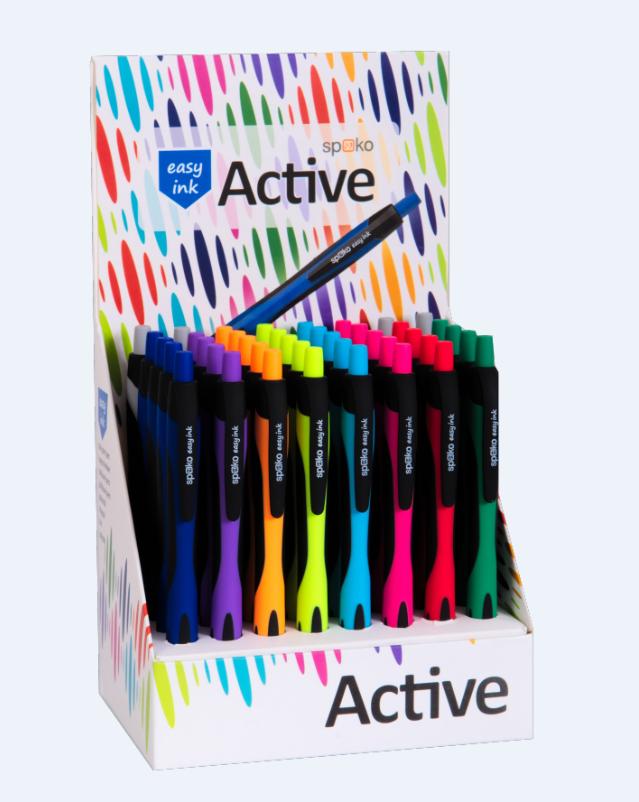Długopis Spoko Active występuje w różnych wariantach kolorystycznych. Ma obudowę dwukolorową, antypoślizgową i specjalny niebieski wkład easyink, który sprawia, że bardzo wygodnie oraz miękko się nim pisze.