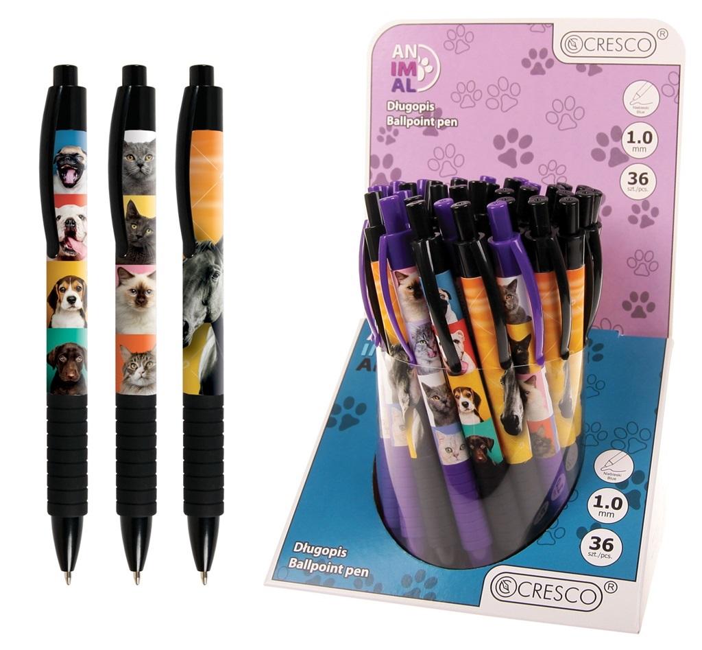 Długopis SERIA ANIMALS nowość CRESCO. Ponadczasowe wzornictwo długopisu czyni go wyjątkowym i uniwersalnym dla każdego. Wykonany został z plastiku, uchwyt natomiast jest softowo-gumowy. Mechanizm włączania pstrykany, wkład typu X22, grubość linii pisania 1mm. W opakowaniu zbiorczym 36 szt - mix 3 wzorów.