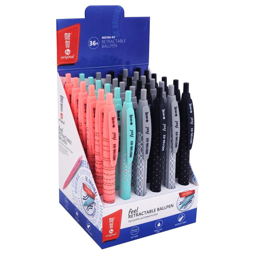 Długopis automatyczny MemoBe Feel. Końcówka pisząca 0,7 mm. Długość linii pisania >500 m. Długopis ze specjalnym tuszem typu Semi-Gel. Miękka w dotyku obudowa. Miękka w dotyku obudowa. Kolor wkładu niebieski. Mix kolorów i wzorów obudowy. Pakowane w display 36 sztuk (6 - różowy, 6 - turkusowy, 12 - szary, 12 - czarny).