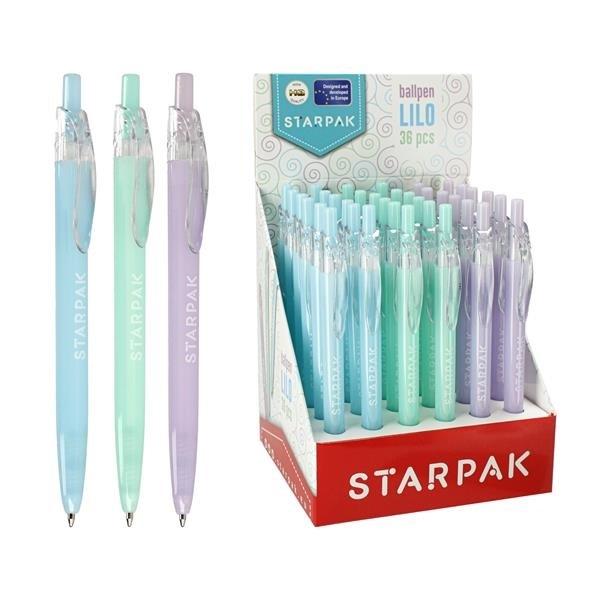 Długopis automatyczny z kolekcji Starpak dedykowanej dla szkoły i biura. Plastikowy długopis w pięknej oprawie w kolorach pastelowych fioletu, turkusu i błekitu. Grubość linii pisania 0,7 mm.