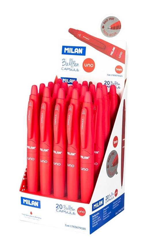 Uno czerwony długopis Capsule, którego korpus ma taki sam kolor jak atrament. Przybliżona długość pisania 1000 metrów. Końcówka 1 mm. Atrament produkowany w Niemczech. Chowany pióro do klikania. Oryginalny projekt stworzony przez dział badań i rozwoju Milan. Rozmiar pióra: 13,4 x 1,6 cm. W opakowaniu 20 sztuk.