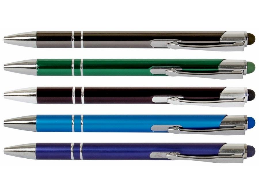 Metalowy długopis, automatyczny, końcówka dotykowa do smartfonów, tabletów i notebooków dotykowych z technologią wyświetlania pojemnościowego, wymienny wkład F-Parker, niebieski kolor tuszu, grubość linii 0,7 mm, miks 5 kolorów metalicznych