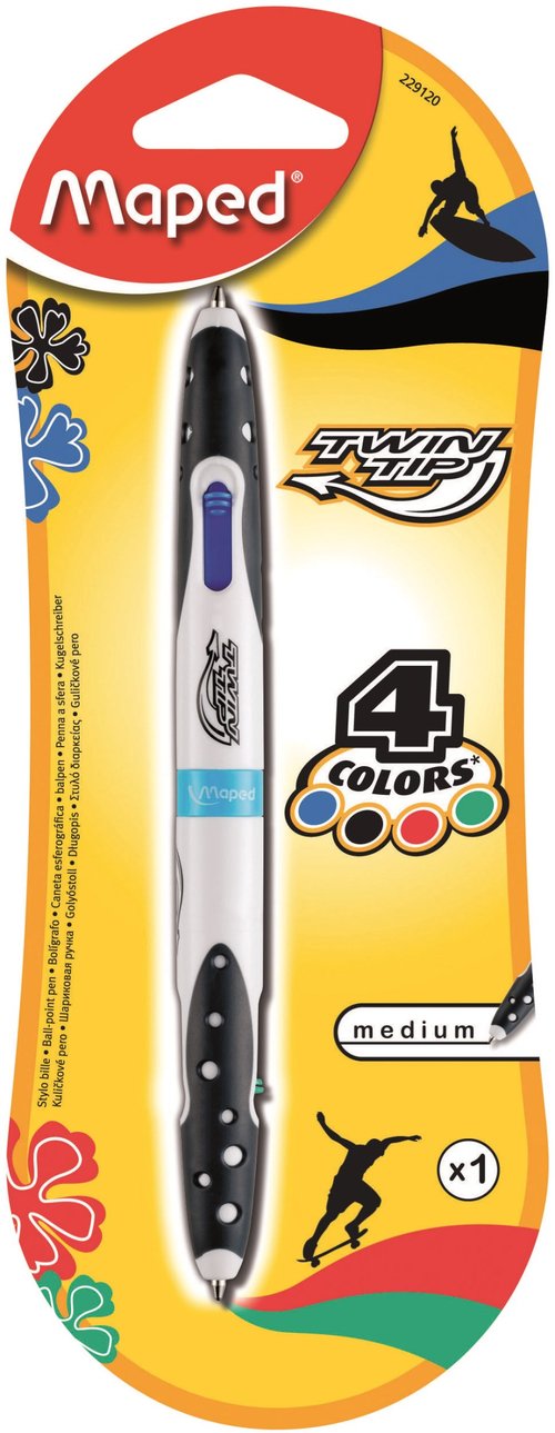 Czterokolorowe długopisy dwustronne - wersja BASIC (kolory wkładów - czerwony, zielony, niebieski i czarny). Innowacyjne rozwiązanie pozwala używać 2 kolorów jednocześnie. Miękka strefa zapewnia optymalny uchwyt i wysoki komfort pisania. Idealny dla osób prawo i leworęcznych. Grubość linii 1.0 mm. Blister