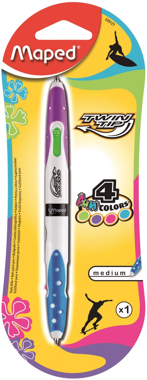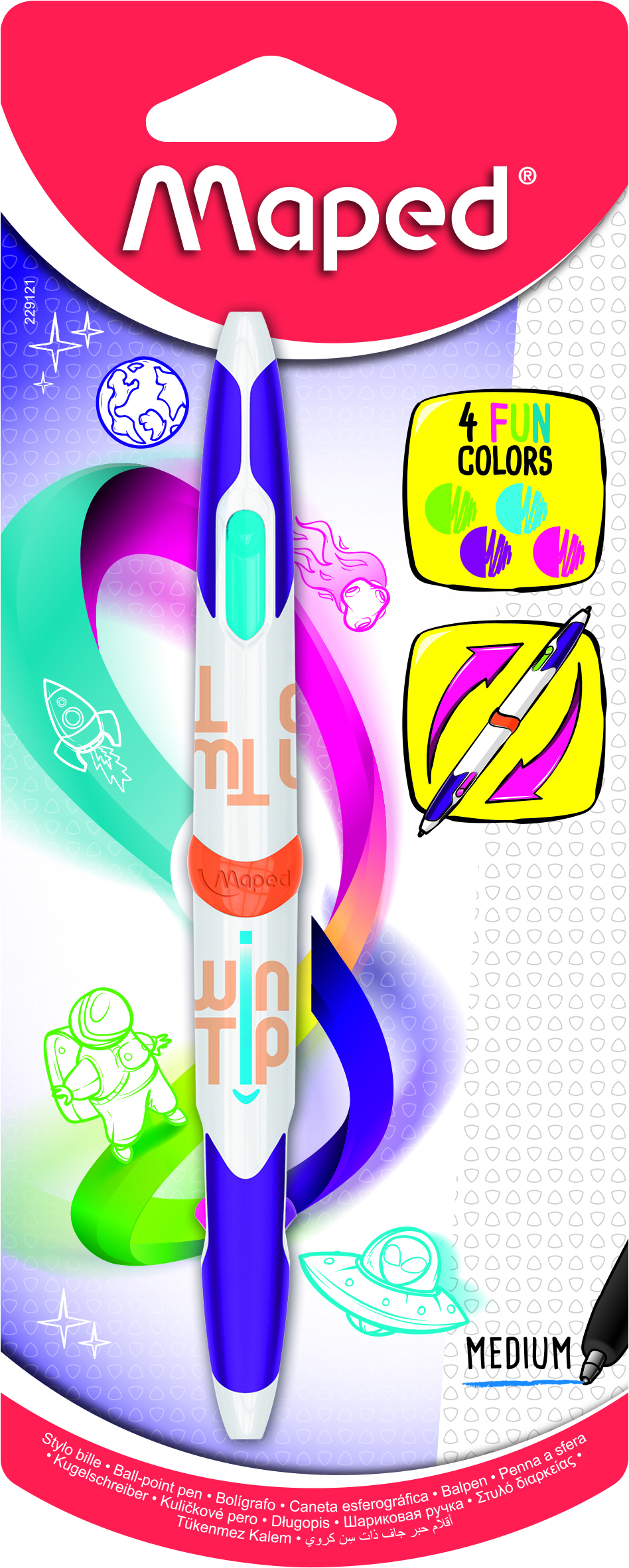 Czterokolorowe długopisy dwustronne - wersja FUN (kolory wkładów - różowy, fioletowy, zielony, błekitny). Innowacyjne rozwiązanie pozwala używać 2 kolorów jednocześnie. Miękka strefa zapewnia optymalny uchwyt i wysoki komfort pisania. Idealny dla osób prawo i leworęcznych. Grubość linii 1.0 mm. Blister