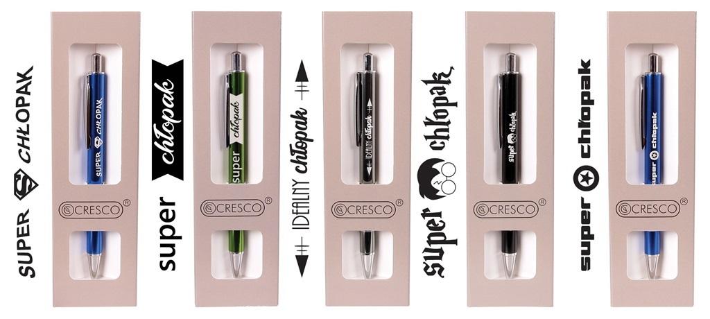 Metalowy, automatyczny długopis CARLOS z nadrukiem jako prezent na różne okazje dla chłopaka, nie tylko na Dzień Chłopaka. Zapakowany w prezentowe etui. Występuje w miksie kolorystycznym z kilkoma wzorami nadruku. Wkład niebieski wymienny.