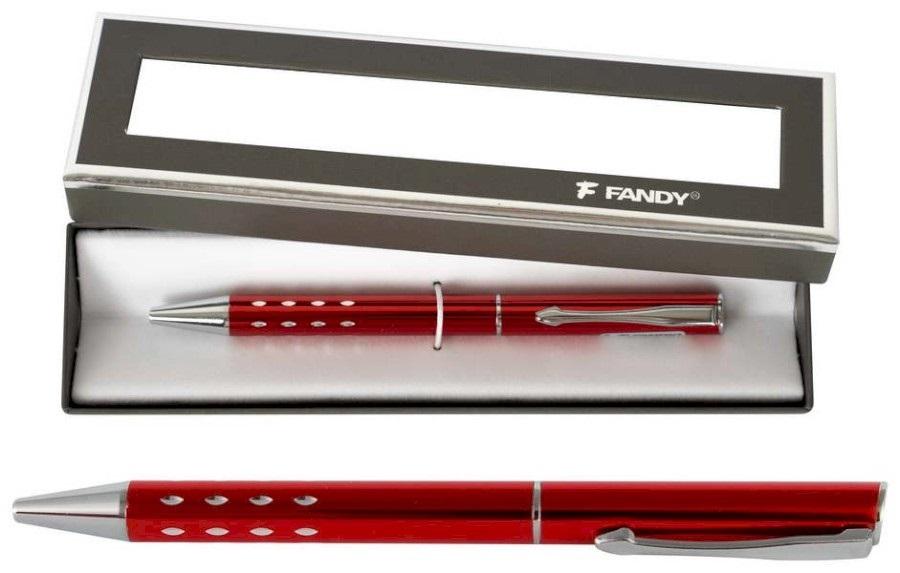 Metalowy długopis, mechanizm obrotowy, wkład wymienny F-Parker, niebieski kolor tuszu, grubość linii 0,7 mm, pudełko upominkowe.
