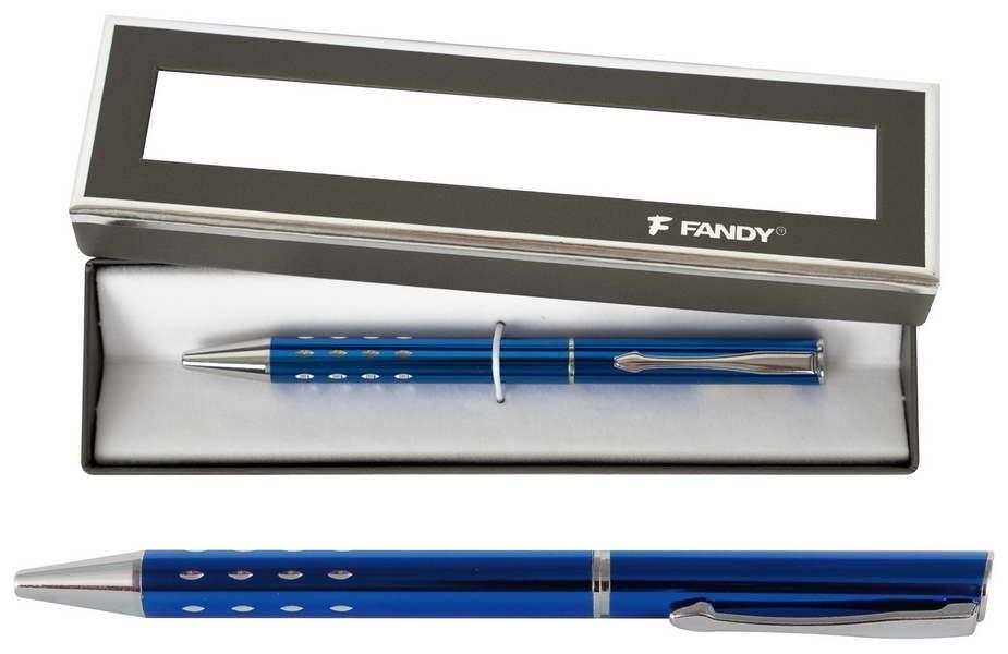 Metalowy długopis, mechanizm obrotowy, wkład wymienny F-Parker, niebieski kolor tuszu, grubość linii 0,7 mm, pudełko upominkowe.
