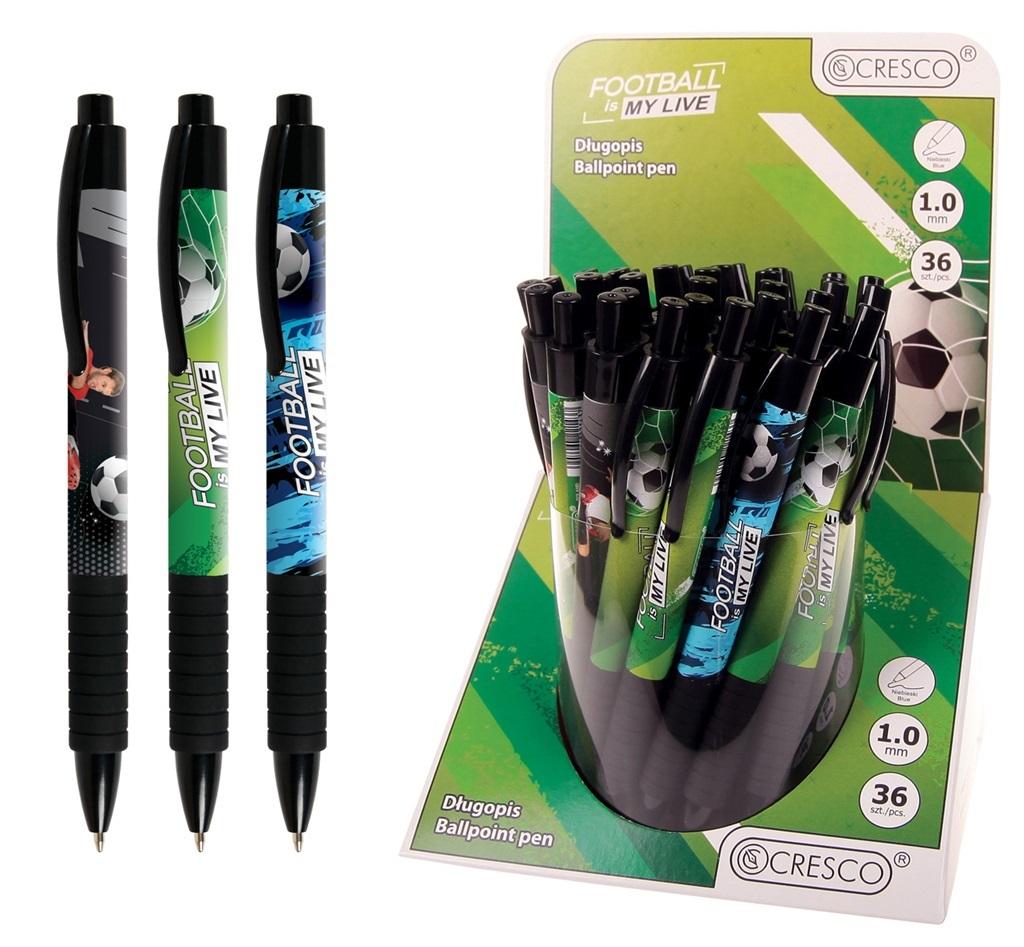 Długopis SERIA FOOTBALL LIVE nowość CRESCO. Ponadczasowe wzornictwo długopisu czyni go wyjątkowym i uniwersalnym dla każdego. Wykonany został z plastiku, uchwyt natomiast jest softowo-gumowy. Mechanizm włączania pstrykany, wkład typu X22, grubość linii pisania 1mm. W opakowaniu zbiorczym 36 szt - mix 3 wzorów.