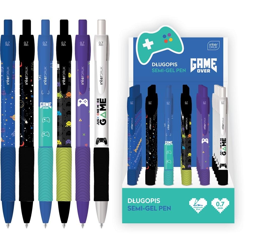 Niebieski wkład. Wygodny gumowy uchwyt. Grubość linii pisania: 0.7 mm. Dostępny w 6 ciekawych, chłopięcych wzorach. 36 szt. w displayu.