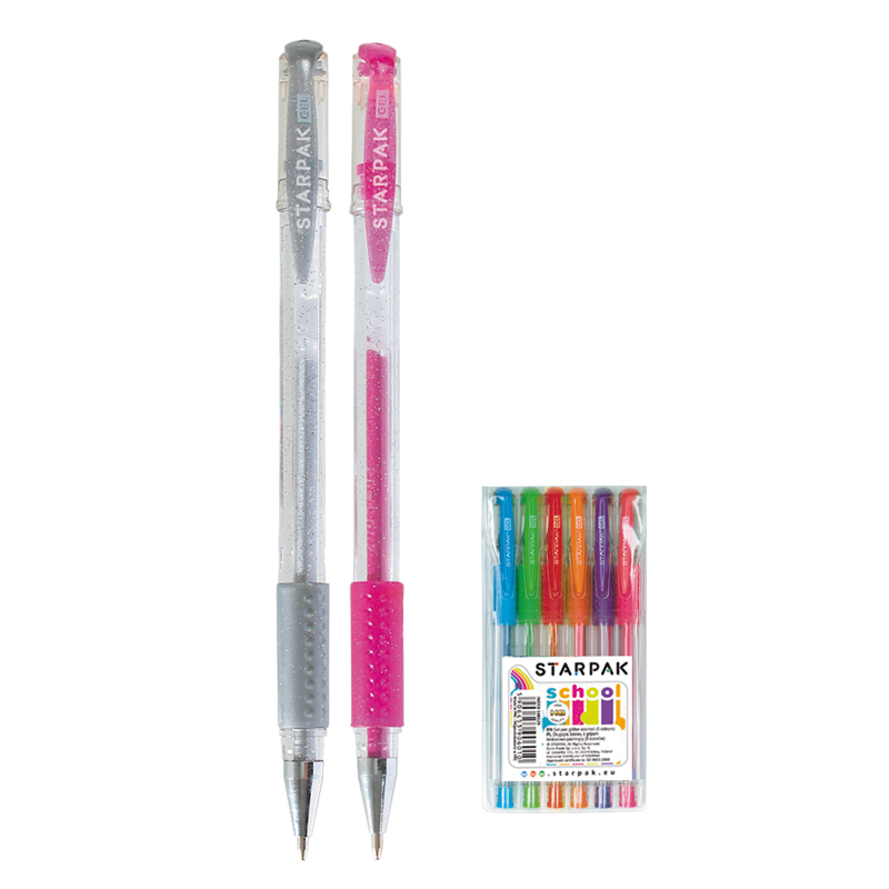 Zestaw długopisów żelowych z brokatem z kolekcji Starpak dla Szkoły. Zestaw składa się z 6 długopisów z zatyczką, w kolorach: fioletowym, czarnym, czerwonym, szarym, zielonym oraz niebieskim. Grubość linii pisania 0,7 mm. Długopisy posiadają gumowy grip, zapewniający mocny uchyt dłoni i komfort pisania. Przezroczysta obudowa produktu umożliwia kontrolę tuszu. Zapoznaj się również z innymi produktami Starpak! Produkt pakowany w plastikowe etui z zawieszką. Przeznaczony dla dzieci w wieku: 3+. Wymiary opakowania(wys.x szer. x gł.) [cm]: 17,5x7,5x1.