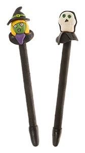 Długopis z motywem Halloween. Czarny długopis zakończony figurką w kształcie zabawnych wzorów czarownicy, kościotrupa oraz innych. Długopis o długości około 16,5 cm.