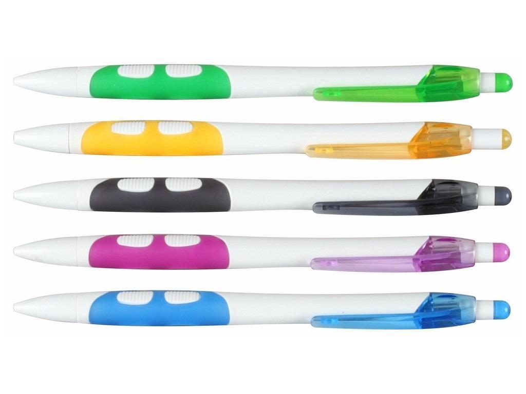 Plastikowy długopis, automatyczny, ergonomiczna obudowa z uchwytem antypoślizgowym, wymienny wkład F-411, grubość linii 0,5 mm, miks kolorów w opakowaniu zbiorczym.