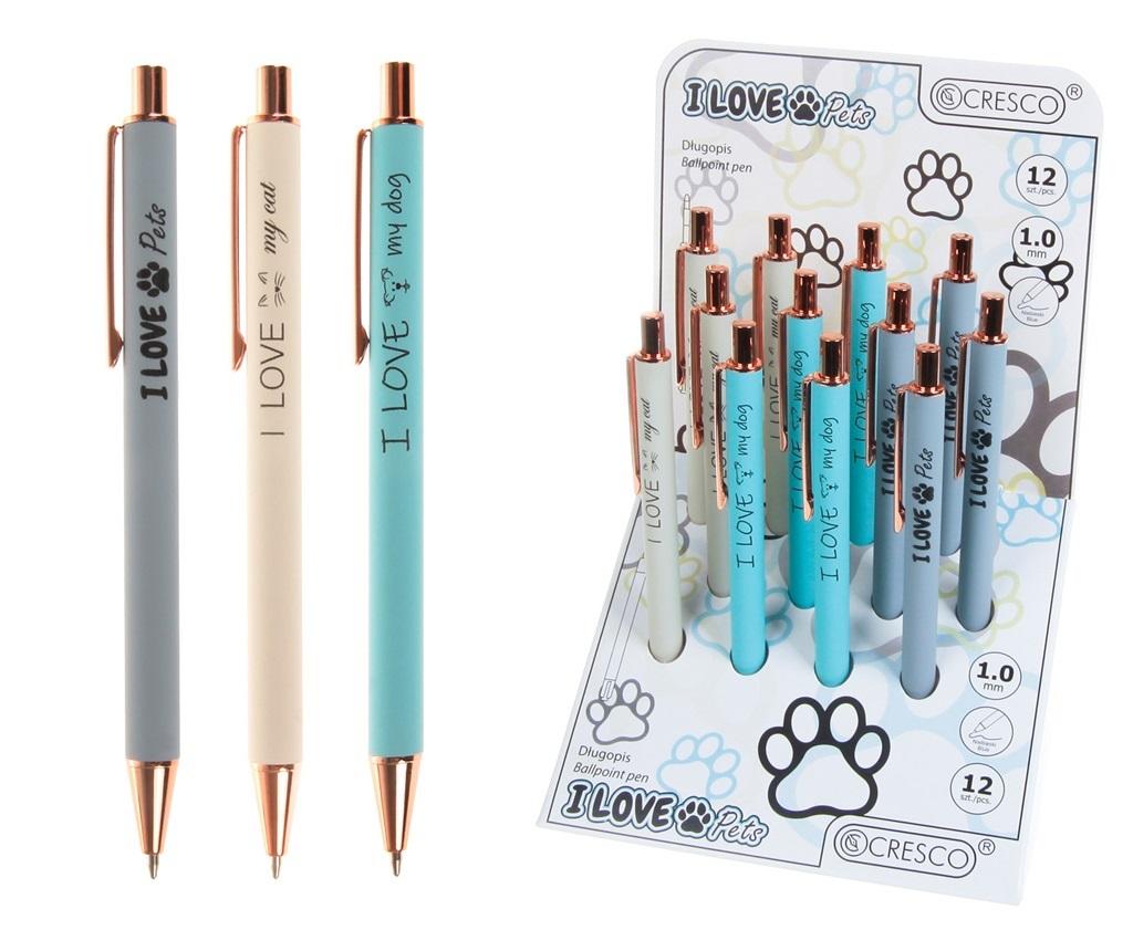 Wyjątkowy długopis z nadrukiem dla miłośników zwierząt - I LOVE PETS. Wykończenia różowe złoto. Korpus: powierzchnia softowa. Długopis wyposażony został w wymienny wielkopojemnościowy wkład typu zenith o grubości 1mm linii pisania. W opakowaniu mix 12szt w trzech kolorach oraz z trzema tematycznymi nadrukami.