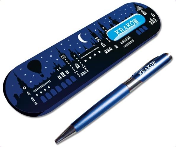 Pamiątkowy długopis z etui ozdobiony motywami związanymi z polskimi miastami.