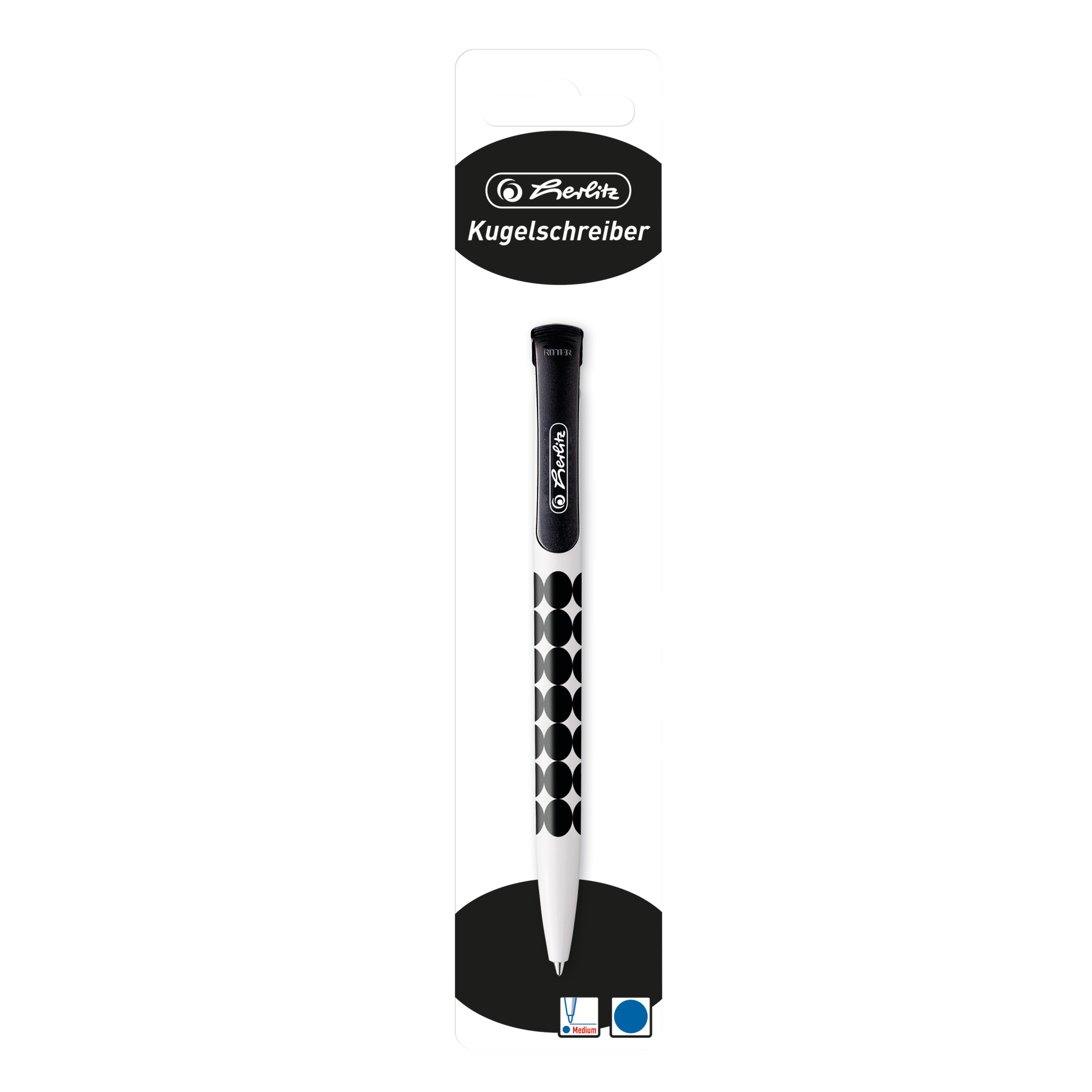 Długopis z niebieskim tuszem z serii Just Black, biała obudowa z czarnym nadrukiem, profilowany kształt ułatwia pisanie, długopis do szkoły lub biura.