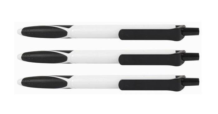 Plastikowy długopis, automatyczny, ergonomiczna obudowa z uchwytem antypoślizgowym, technologia double injection guma+plastik, wymienny wkład F-411, niebieski kolor tuszu, grubość linii 0,7 mm, 50 sztuk w paczce.