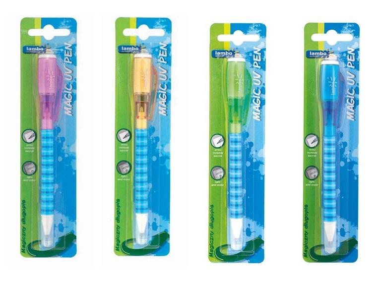 Długopis z zatyczką i dodatkową końcówką do pisania niewidzialnym tuszem. W zestawie również latarka UV.