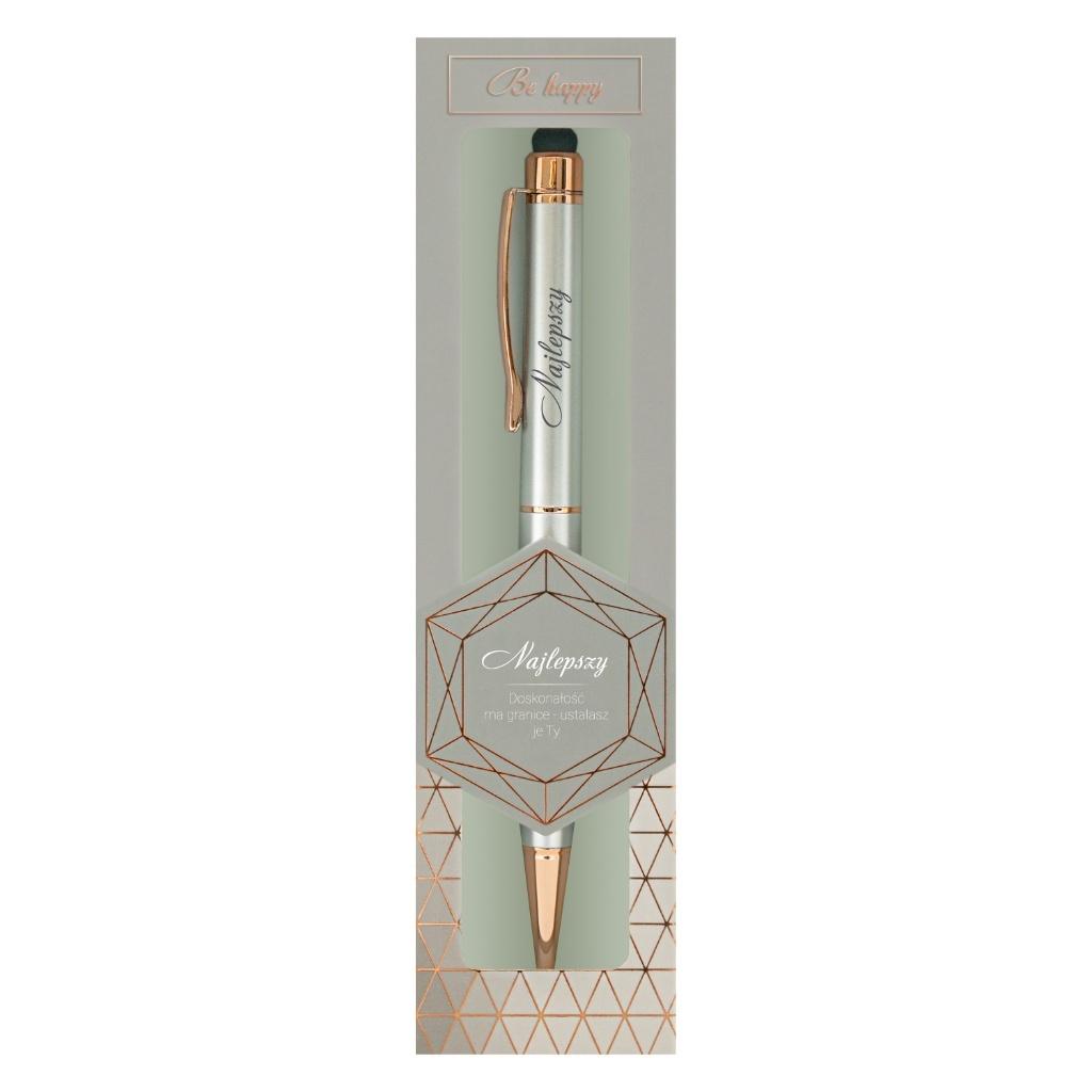 Wyjątkowy długopis prezentowy z napisem (dedykacja widoczna na zdjęciu) to doskonały sposób na okazanie wdzięczności i podarowanie praktycznego upominku. Klasyczny design w pastelowych odcieniach, wraz z subtelnym napisem sprawia, że produkt wyróżnia się elegancją i ponadczasowym stylem. Długopis wyposażony jest w funkcjonalną końcówkę typu touch pen, umożliwiającą wygodne korzystanie z urządzeń z ekranem dotykowym, co czyni go praktycznym na co dzień. Wkład w kolorze niebieskim można łatwo wymienić, dzięki czemu długopis posłuży przez długi czas. Całość zapakowana jest w eleganckie pudełko prezentowe, gotowe do wręczenia. Specyfikacja produktu: Napis: (widoczny na zdjęciu); Funkcjonalność: końcówka typu touch pen do ekranów dotykowych; Kolor wkładu: niebieski (wymienny); Opakowanie: eleganckie pudełko prezentowe; Materiał: metal