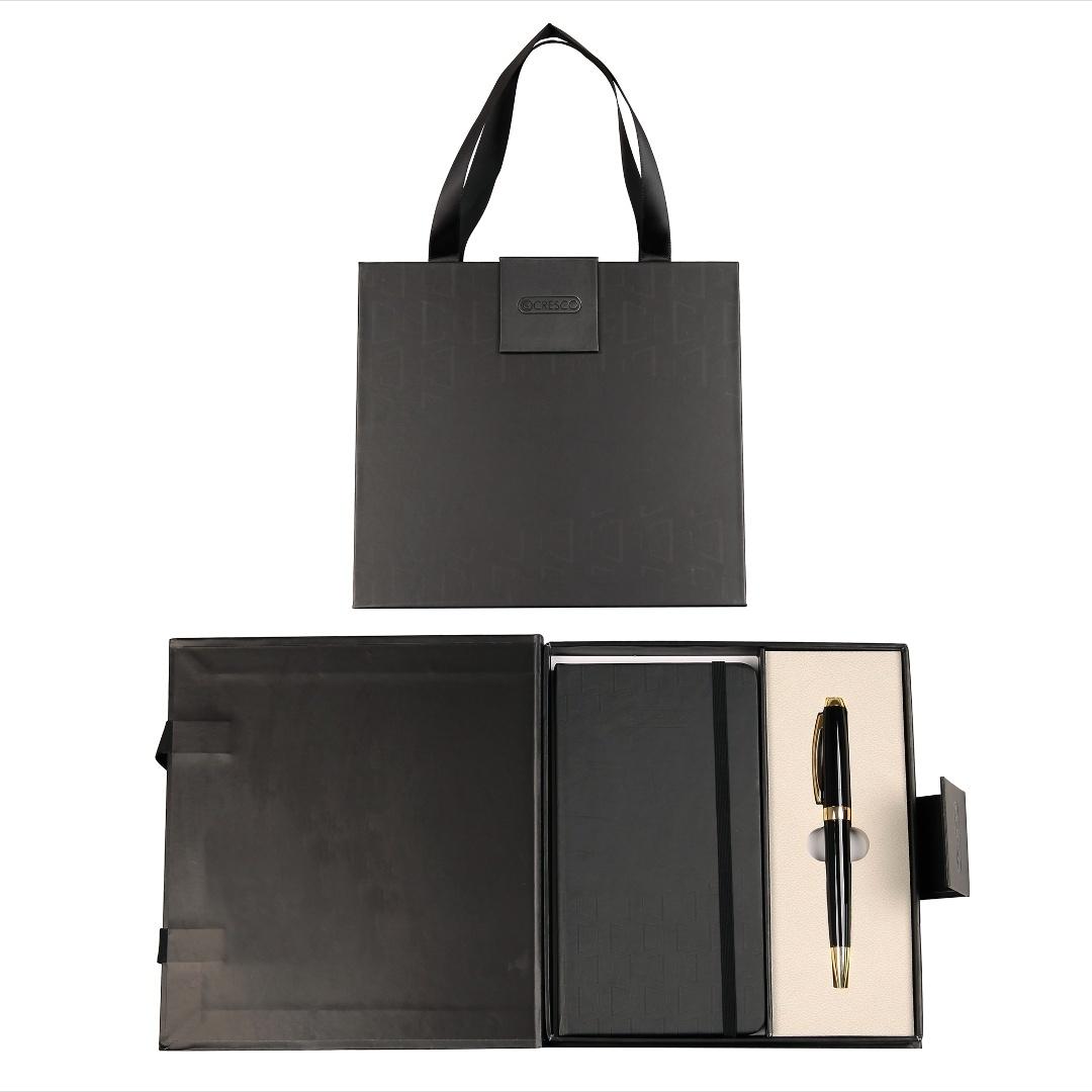 Zestaw prezentowy w ciekawym opakowaniu imitującym torebkę prezentową. Komplet zawiera notes z gumką i wstążką oraz elegancki czarny długopis SYMPHONY ze złotymi wykończeniami. Zestaw upominkowy spakowany w kartonowe etui z zapięciem magnetycznym. Po zamknięciu opakowanie przybiera postać torebki prezentowej z uchwytami ze wstążki. Zatem po zakupie jest to gotowy prezent do wręczenia na różne okazje.