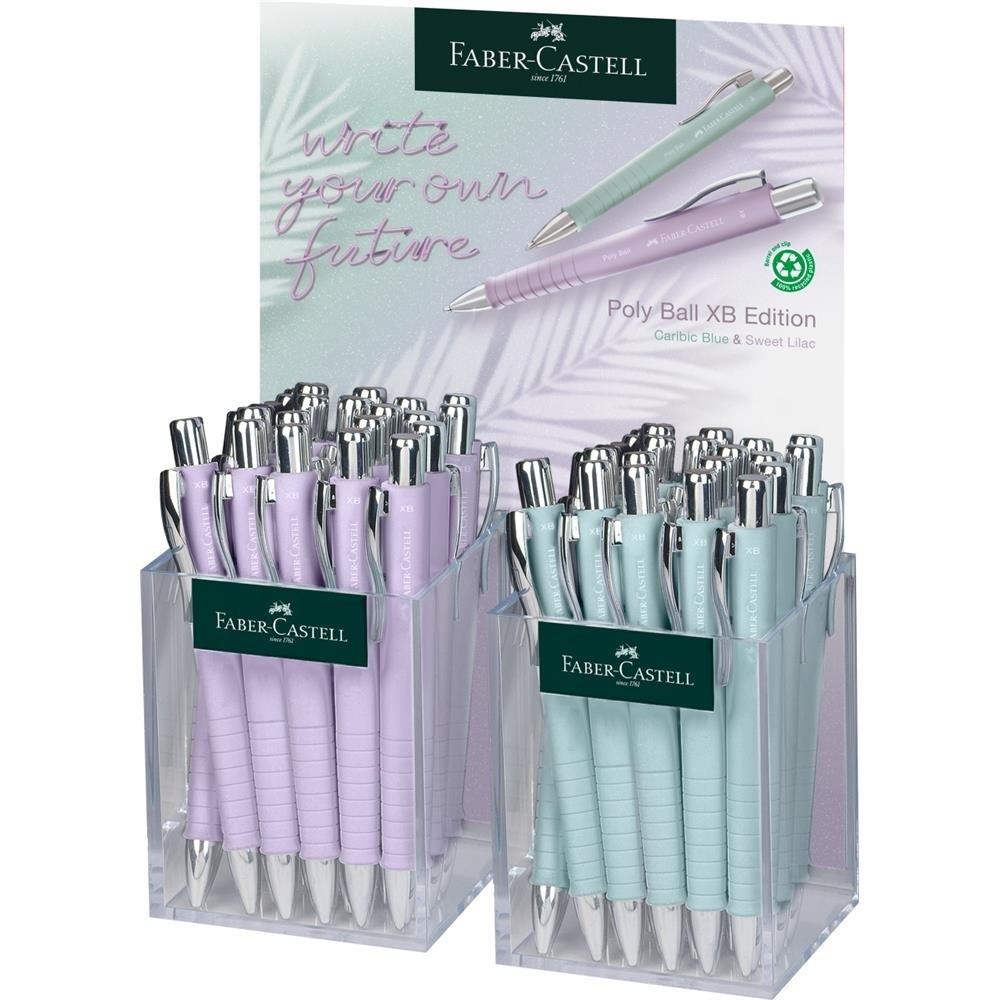 Display z długopisami automatycznymi Poly Ball Faber-Castell 24 szt. w kolorze matowym liliowym (Sweet Liliac) i błękitnym (Caribic Blue). To połączenie klasyki i nowoczesności z funkcjonalnością. Przyjemna w dotyku, miękka powierzchnia w modnych kolorach gwarantuje wysoki komfort pisania bez zmęczenia, nawet przy obszernych tekstach. Ergonomiczny trójkątny kształt strefy uchwytu i rowki na powierzchni korpusu zapewniają dodatkową wygodę użytkowania. Z niebieskimi, wymiennymi wkładami o dużej pojemności i elastycznym metalowym klipsem. Odpowiednie do wypełniania dokumentów. Grubość linii pisania XB.