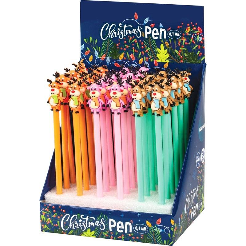 Fantazyjny długopis zamykany na skuwkę zakończony figurką renifera, pakowany na displayu (36). Tusz w kolorze niebieskim.