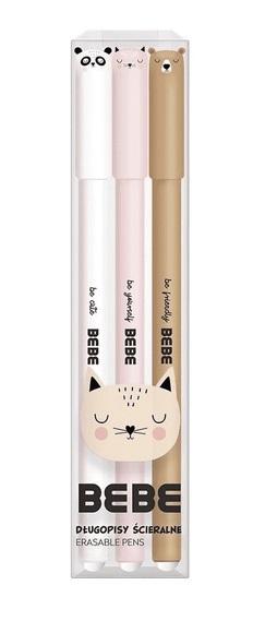 Zestaw 3 sztuk długopisów ścieralnych. Niebieski wkład. Zakończony gumką. Ściera nie pozostawiając śladów. Skuwka z uszkami zwierzaków z serii BB Friends. Idealny zestaw dla pierwszoklasisty i na prezent.