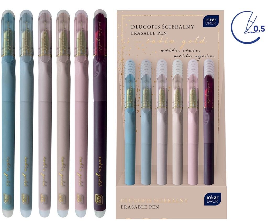 Funkcjonalny i stylowy długopis ścieralny. Niebieski wkład. Grubość pisania: 0.5 mm. Zamykany na skuwkę. Obustronnie zakończony gumką, która umożliwia szybką i estetyczną korektę napisanego tekstu, bez użycia korektora czy przekreślania. Subtelne, złote detale na obudowie. Dostępny w 6 wzorach. 36 szt. w displayu.